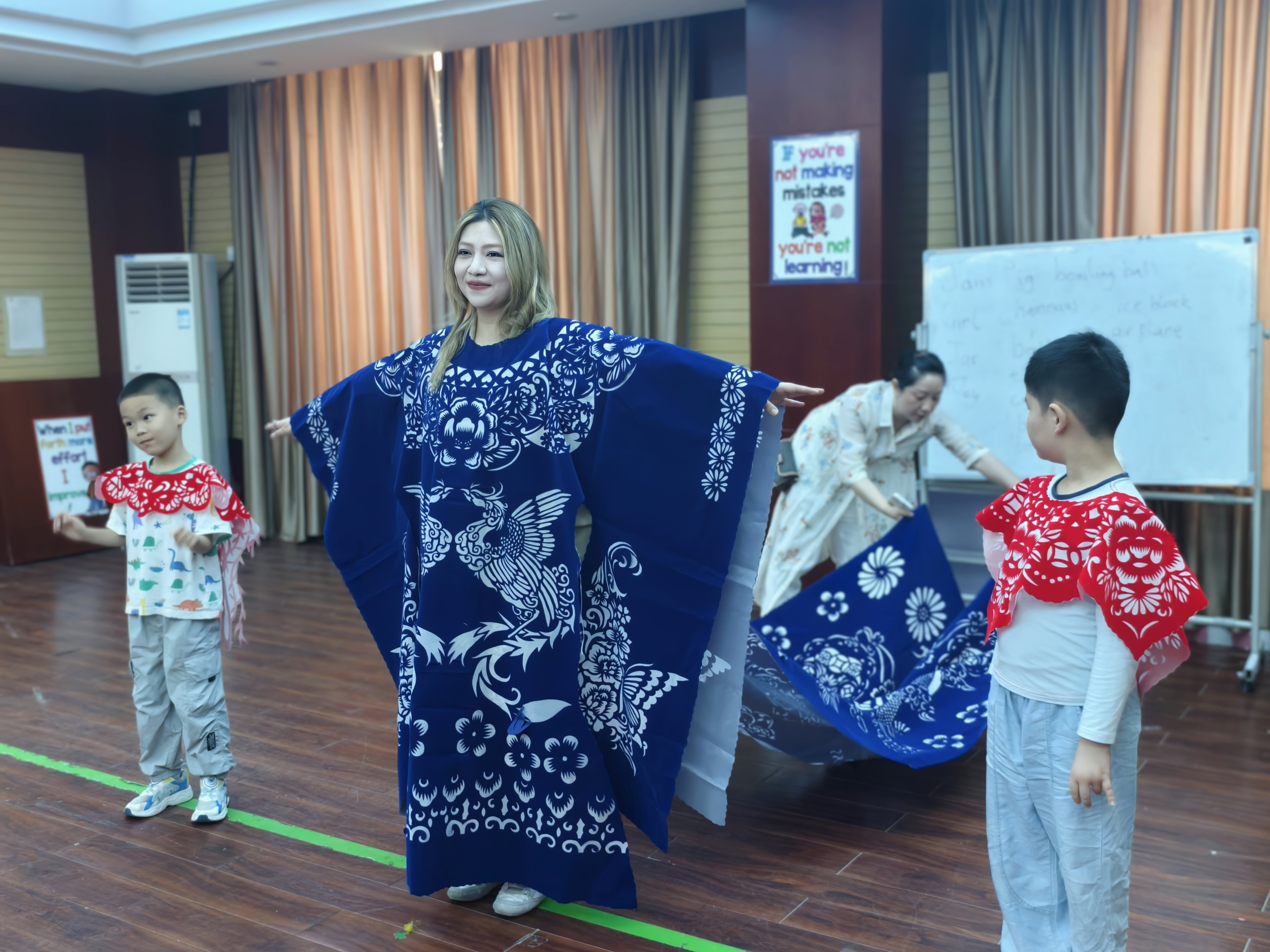 活动伊始,侯新月老师首先展示了色彩鲜艳、图案精美的4米剪纸国服和云肩吸引众人目光并争相试穿。剪纸服饰布满传统纹样,幼儿与家长穿上这些服装,仿佛穿越时空,沉浸式感受剪纸艺术与服饰文化的融合之美,纷纷拍照留念。